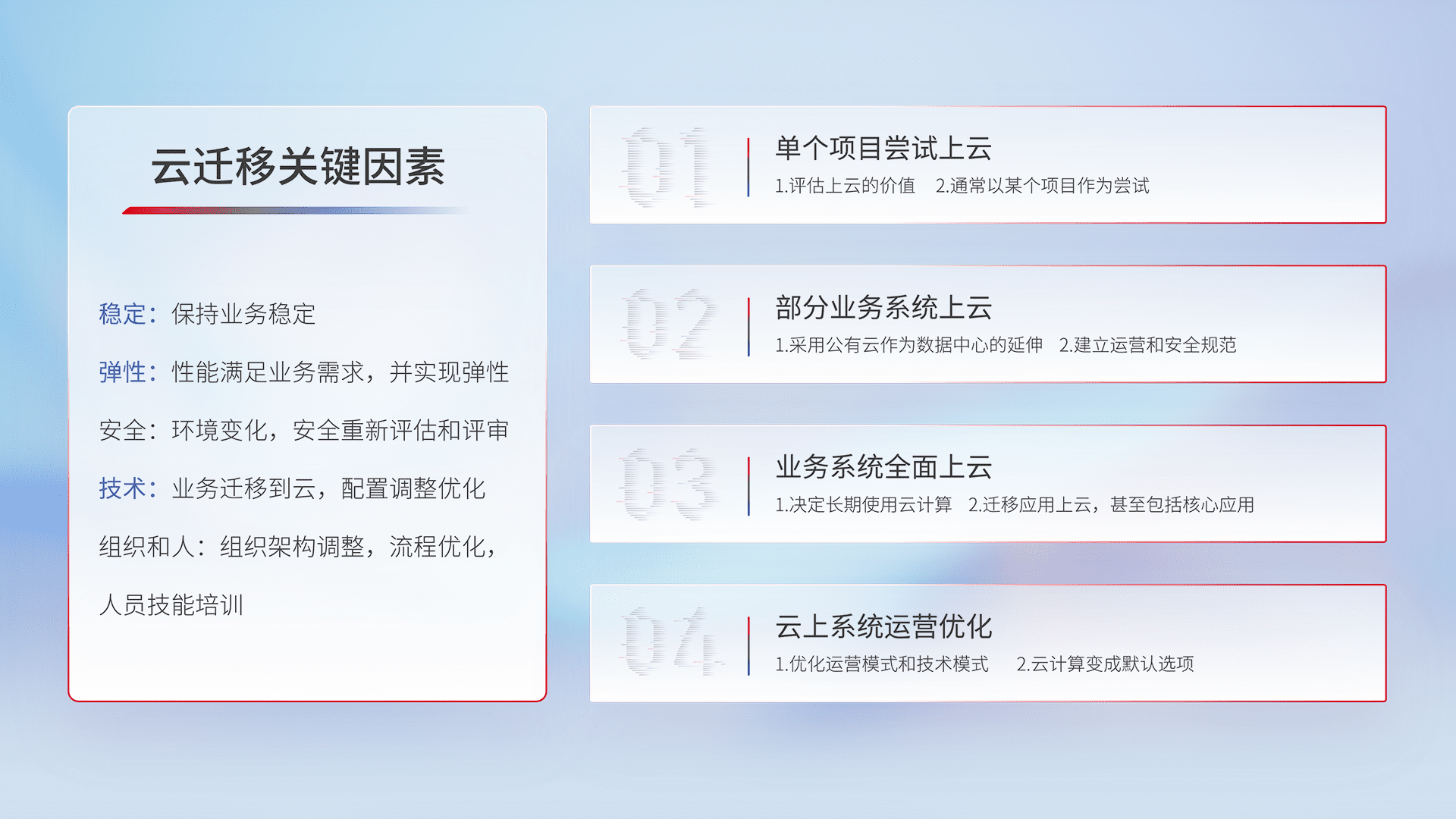 结合实际业务,,,从规划设计、、、、云平台选型、、、云原生改造、、数据迁移、、、、集成交付,,,迁移全过程为客户识别最佳上云路径,,做好风险识别管理,,设计网络架构、、、身份权限、、安全审计合规、、操作审计、、日志审计、、、监控告警策略、、多站点容灾设计等,,,,对云上基础设施进行整体规划,,提升IT治理水平,,,以满足弹性、、高可用、、高性能的需求。。。。