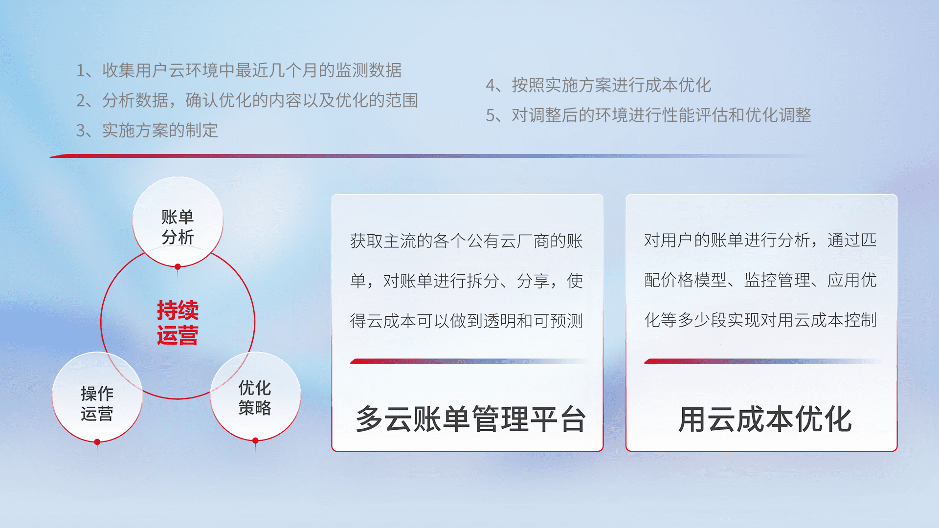 通过多云纳管,,,,以统一的资源数据模型把客户的云资源进行抽象和封装,,,进而实现对多云资源的统一操作,,保障云资源管理的可靠性、、、稳定性与可用性。。。。量身定制化运维内容,,配置、、、开发运维、、补丁管理、、、、备份、、、监控、、、认证和访问管理、、、、审计和日常巡检等,,,,保障在用云过程中的可靠度,,,稳定度以及高可用率。。